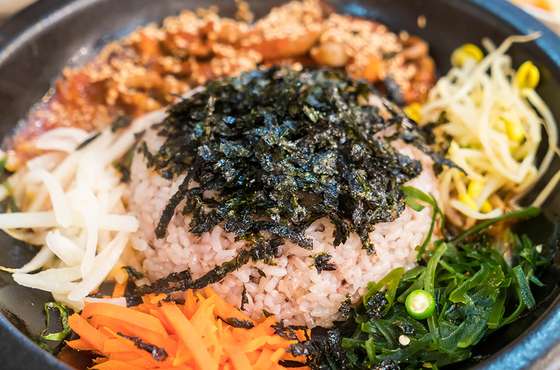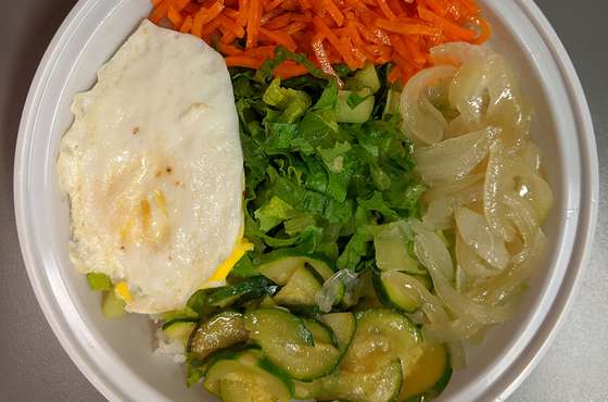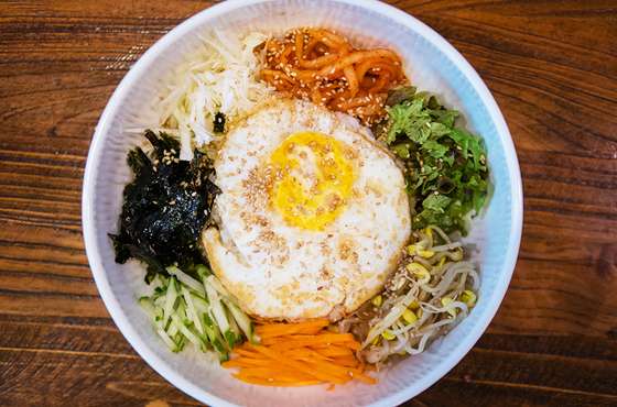 A classic Korean rice dish made with seasoned vegetables and fried egg.